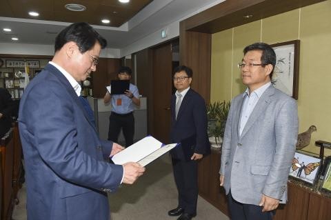 ▲ 원창묵 원주시장(왼쪽)이 4일 고문변호사에게 위촉장을 전달하고 있다.<사진제공=원주 시청> |