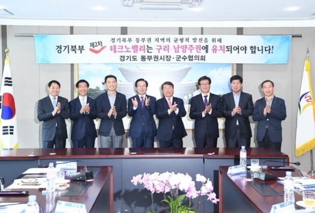 경기도동부권협의회(회장 조억동 광주시장)는 7일 광주시청에서 백경현 구리시장, 최현덕 남양주시 부시장 등 8개 시·군 단체장 및 부단체장이 참석한 가운데 정례회의를 열고 경기북부 제2차 테크노밸리 조성사업 후보지로 진정 다수의 도민들이 원하는 게 무엇인지를 감안 구리·남양주 권 공동유치 건의안을 만장일치로 채택하고 건의안 내용을 경기도 남경필 도지사에게 전달할 예정이다.