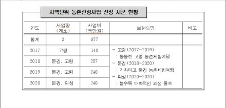 2017년에 선정된 고령군은 3년 동안 대가야 문화를 중심으로 역사문화 탐방 · 가야금 체험 · 전통엿 만들기 등의 농촌체험 관광 상품을 운영해 관광객 2천6백 명이 방문하는 성과를 이뤘다.