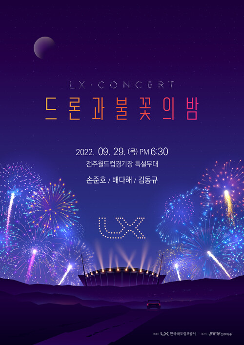 [세계로컬타임즈 조주연 기자] 한국국토정보공사가 “오는 29일 JTV전주방송과 손잡고 전주월드컵경기장 동측 광장 특설무대에서 국토정보공사 콘서트‘드론과 불꽃의 밤’을 개최한다”고 21일 밝혔다.