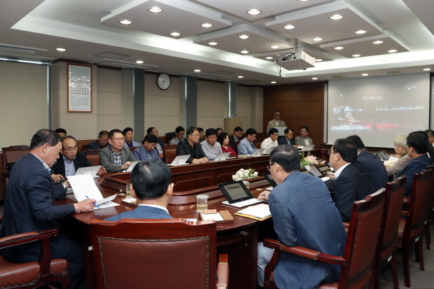 | ▲ 김성기 가평군수(왼쪽)가 4일 군청 소회의실에서 읍면장, 실과소장 등이 참석한 가운데 국제 재즈페스티벌 운영계획 보고회를 열고 있다.<사진제공=가평군청> |