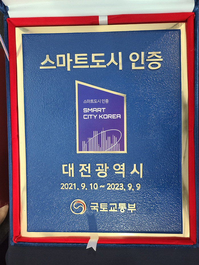 [세계로컬타임즈 민순혜 기자] 대전시는 국토부가 주관하는 스마트도시 인증 공모사업에서 우수한 평가를 받아 2회 연속 스마트도시 인증기관으로 선정돼 제5회 월드스마트시티 엑스포에서 인증서와 동판을 받았다.