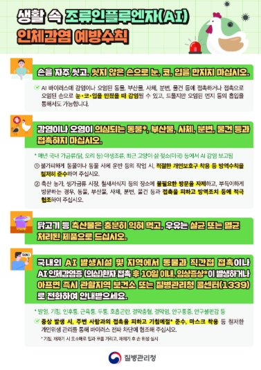 인체감염 예방을 위해서는 ▲손을 자주 씻고, 씻지 않은 손으로 눈·코·입을 만지지 않기 ▲감염 또는 오염이 의심되는 동물과 부산물, 사체, 분변, 오염된 물건과 접촉하지 않기 ▲닭고기 등 축산물은 충분히 익혀 섭취하고 우유는 살균·멸균 처리된 제품을 마시기 등 기본적인 예방수칙을 철저히 지켜야 한다.