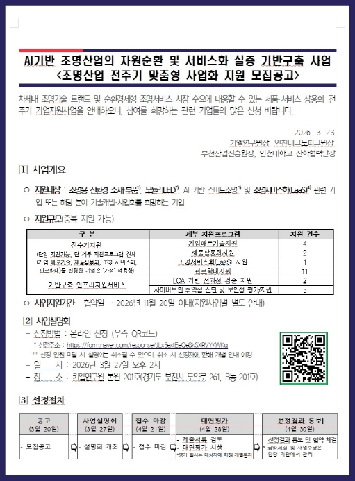 참여를 희망하는 기업은 4월 21일(화)까지 주관기관인 키엘연구원을 통해 신청하면 된다. 아울러 사업 이해를 돕기 위한 설명회는 오는 3월 27일 오후 2시 키엘연구원 본원(B동 201호)에서 개최되며, 공고문 내 QR코드를 통해 사전 신청할 수 있다.