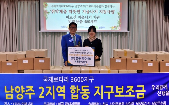 이번 전달식은 추운 겨울을 보내는 취약계층의 건강 보호와 생활 안정을 지원하기 위해 마련됐다. 국제로타리 3600지구 남양주 2지역 소속 로타리클럽 회원들이 뜻을 모아 방한용품을 후원하며 따뜻한 지역사회를 위한 나눔 활동에 참여했다.