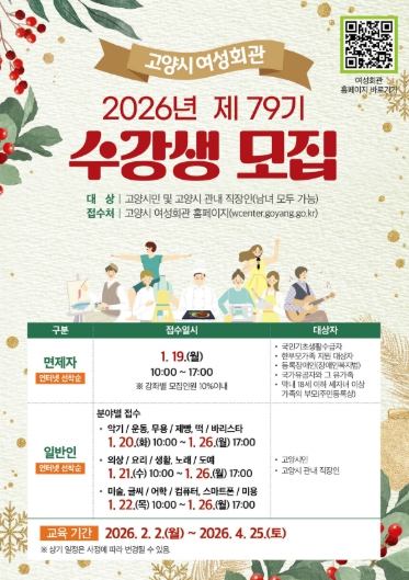 시 관계자는 “제79기에는 작년에 실시한 수요조사 결과를 반영한 신규 강좌들이 개설될 예정이니, 많은 시민의 관심과 참여를 부탁드린다”며 “고양시 여성회관은 시민 역량 강화를 위해 지속적으로 노력할 것”이라고 밝혔다.