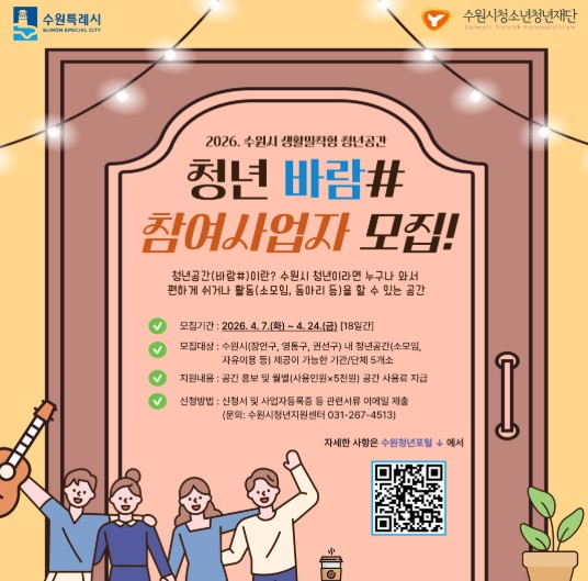 참여를 희망하는 기관‧단체는 2026년 4월 7일부터 4월 24일까지 신청할 수 있으며, 세부 공모내용과 신청방법은 수원청년포털에서 확인할 수 있다.