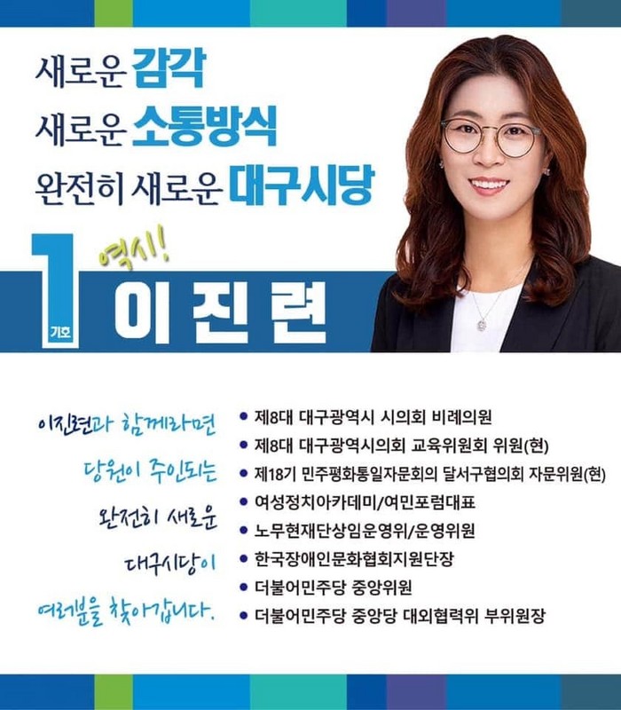 먼저, 기호 1번 이진련 후보는 ‘새로운 감각, 새로운 소통방식, 완전히 새로운 대구시당’이라는 슬로건을 내걸고 출마했다.