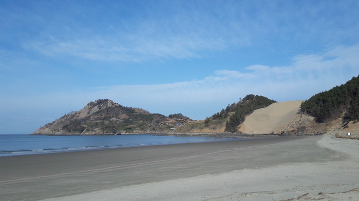 | ▲ 우이도 풍성사구와 돈목해수욕장. 돈목해수욕장에서 바라본 모래언덕(풍성사구·사진 오른편 산 사이의 모래)과 성촌마을. 이곳 모래언덕은 강한 서해바람이 모래를 쌓이게 해서 만든 사구이며, 이처럼 바람에 의해 형성된 사구로는 이 모래언덕이 동양에서 가장 높다고 한다. (사진=서해지방해양경찰청) |
