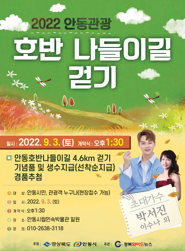 [세계로컬타임즈 이장학 기자] 안동시는 ‘2022 안동 호반 관광나들이길 걷기’ 행사가 오는 9월 3일 안동시립민속박물관 및 호반 나들이길 일원에서 개최된다고 31일 밝혔다.