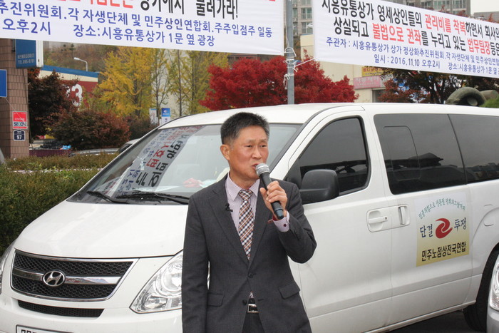 | ▲ 시흥유통상가 박완근 이사가 10일 오후 시흥유통상가 광장에서 경영권 회복과 관리사무소 직원퇴출 및 법조비리 규탄 집회에서 연설을 하고 있다. 유영재 기자 |