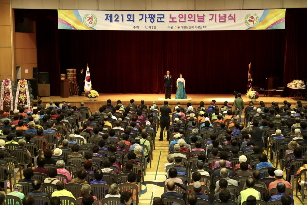이날 식전행사로는 가평군 홍보대사 겸 가수인 윙크의 축하공연 등이 열렸으며 기념식에선 어려운 여건속에서도 노인복지와 경로효친에 기여한 공로로 상면 서기영씨 등 모범노인 17명과 설악면 위곡2리 경로당 등 모범단체 5개소에 대한 표창장을 수여했다.