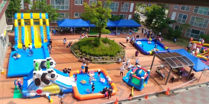 부영그룹은 지난 5일~6일 14개 부영아파트 단지에 슬라이드·에어풀장·에어아치 등 물놀이 시설을 설치해 지금까지 49개 단지를 마무리했다. 오는 8월 17일까지 부산전포, 전주하가 등 11개 단지를 더하게 된다.