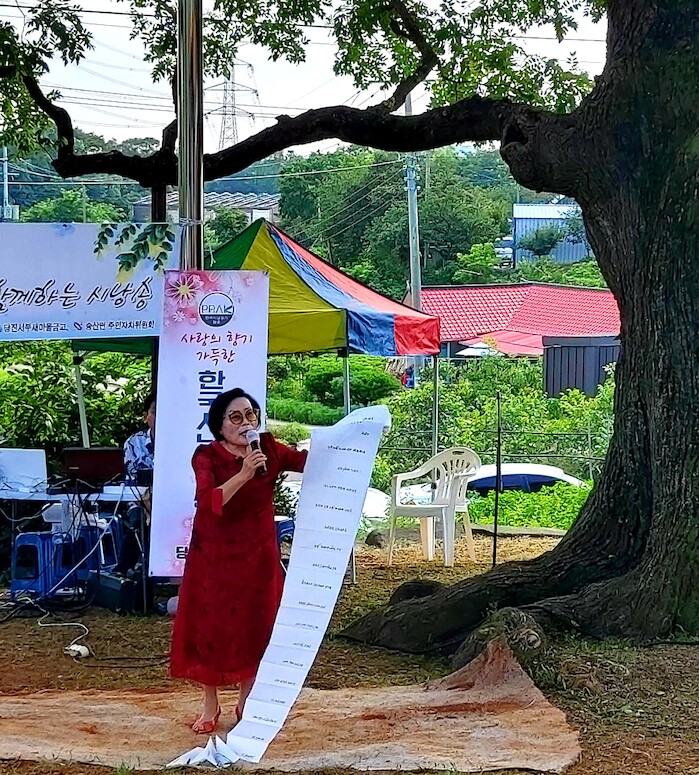 [세계로컬타임즈 홍윤표 조사위원] 당진시낭송회 유정순 회장은 지난 17일 오후 당진송산면 500년 자란 천년기념물 회화나무 아래서 신춘문예 5관왕이자 전 대한민국예술원장인 당진송산출신 이근배 시인 사랑의 향기를 전하는 시를 160번째 기획으로 시낭송회를 열었다