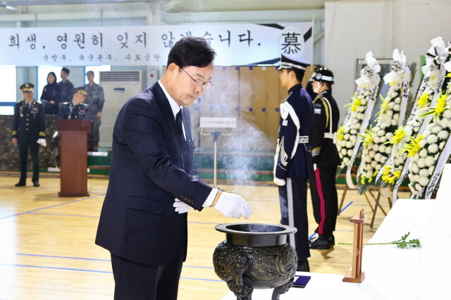 | ▲ ‘2023년 의왕시 6·25전사자 발굴 유해 영결식’에서 김성제 시장이 분향하고 있다.(사진=의왕시) |