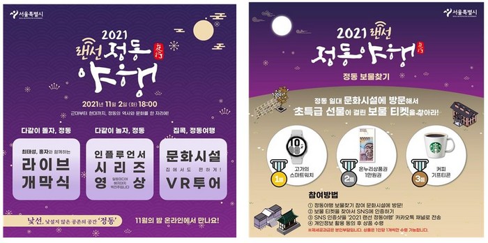 2021 정동야행의 흥미로운 점은 실시간 투어의 흥미를 더하기 위한 시청자 퀴즈를 진행하고 정답자에게는 사은품을 증정한다. 정동 시간여행 퀴즈 정답을 아는 시청자는 ‘2021 랜선 정동야행’ 카카오톡 채널을 추가하고 정답을 발송해 참여할 수 있다.