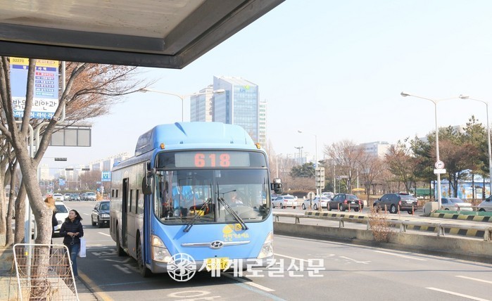 | ▲ 대전 618번 시내버스가 승객을 태우기 위해 버스정류장에 진입하고 있다.<사진= 오영균 기자> |