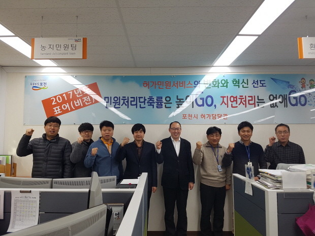 | ▲ 포천시 허가민원과 직원들이 민원 단축 처리를 다짐하며 기념촬영하고 있다.<사진제공=포천시청> |