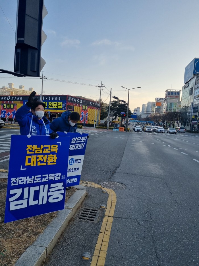 [세계로컬타임즈 김명진 기자] 김대중 전남교육감 예비후보는 7일 오전 예비후보 사무실(전남 순천시 연향3로 5보임빌딩 5층)에 알림 현수막을 게첨하고 본격적인 소통일정으로 대중교통 릴레이 캠페인을 시작했다.