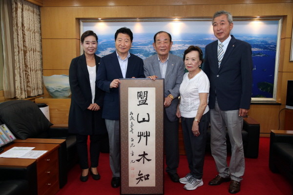 | ▲ 재일교포 김청정씨(78·가운데)가 지난 21일 안상수 창원시장(왼쪽 두번째)에게 백범 김구 선생의 친필 유묵 '맹산초목지'을 전달한 후 기념촬영하고 있다.<사진제공=창원시청> |