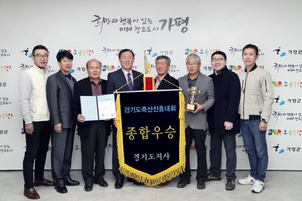 | ▲7일 2017 경기도 축산진흥대회에서 시·군 종합평가 종합우승과 지역축협 최우수상을 수상을 받았다.(좌측에서 네번째 김성기 가평군수)<사진제공=가평군청> |