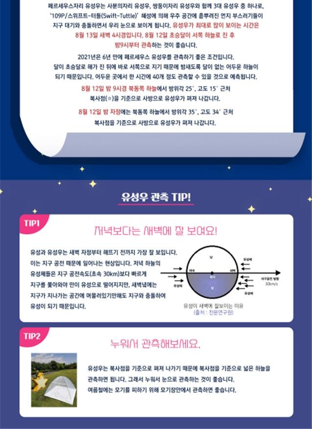 다만, 코로나로 지친 시민들의 힐링을 위해서 비대면으로 별똥별을 관측할 수 있도록 서울의 공원 홈페이지에 별똥별 관측방법을 소개하고, 국립과천과학관에서 촬영하는 라이브 중계 영상도 제공할 예정이다.
