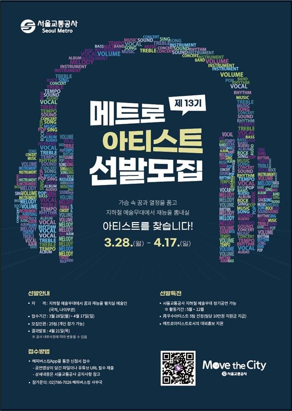 [세계로컬타임즈 이효진 기자] 서울교통공사는 지하철 예술무대에서 공연할 메트로아티스트 25팀을 4월 17일까지 공개 모집한다.