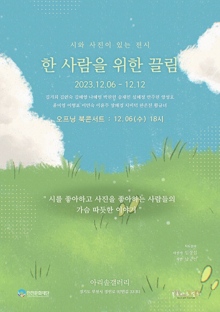 [세계로컬타임즈 김영식 기자] 임상섭 사진작가와 남궁선 시인이 진행했던 시와 사진을 조화롭게 결합한 전시 ‘한 사람을 위한 끌림’이 부천의 아리솔갤러리에서 12월 6일부터 12일까지 진행된다.