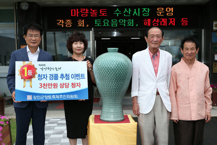 경품 전달식에는 이승옥 강진군수와 김재정 강진군향토축제추진위원회 위원장이 참석해 1등에 당첨된 광주 서구 김길자씨에게 3000만원 상당의 청자를 전달했다.
