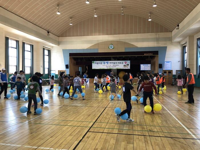 | ▲ 21일 충남 당진 원당초등학교에서 열린 명랑운동회에서 60여 명의 아동들이 함께 런닝맨 풍선 터트리기를 하고 있는 모습. <사진제공=당진시청> |