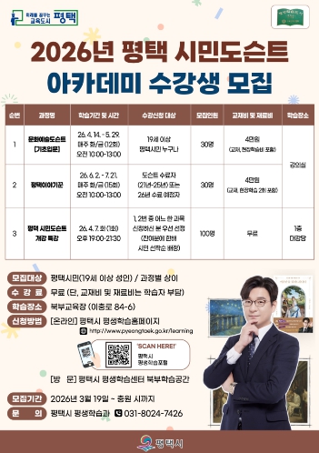 한편, ‘평택 시민도슨트 아카데미’는 2025년 경기도 평생학습대상에서 우수사례로 선정된 바 있다. 배움을 지역과 연결하고 다음 세대와 잇는 평생학습 모델로 꾸준히 주목받고 있다. 수강 신청은 평생학습포털에서 온라인으로 가능하다.