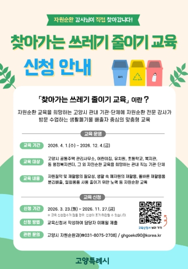 신청 기간은 오는 3월 23일부터 11월 27일까지며 이메일로 신청하면 된다. 신청 서류 등 자세한 사항은 고양시청 누리집에서 확인하거나 고양시청 자원순환과로 문의하면 된다.