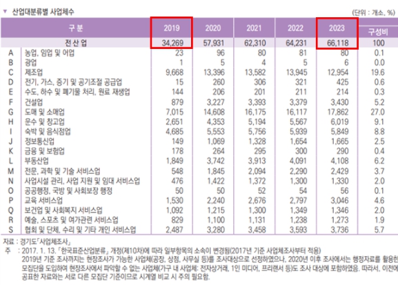 먼저, ▲기업체 분야를 살펴보면 2023년 기준 김포시 전체 사업체 수는 66,118개소로, 2019년 대비 31,849개소(92.9%↑)가 증가했다. 특히 에너지 산업(전기·가스 등) 분야의 성장세가 뚜렷했으며, 300~499명 규모의 중대형 사업체도 250% 늘어 지역 경제의 자족 기능이 강화되고 있는 것으로 분석된다.
