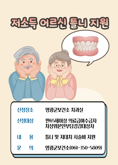 지원 대상은 신청일 기준 영광군에 1년 이상 주민등록을 두고 거주한 만65세 이상 의료급여(1종·2종)수급자, 차상위본인부담경감대상자이다. 또한, 7년 이내 치과 의료기관에서 건강보험 적용받아 의치 시술을 받은 자는 제외되며, 신청은 보건소 치과실로 방문하여 신청자의 구강 상태를 검진한 후 의치 시술이 필요하다고 판단되면 지원 대상자로 선정한다.