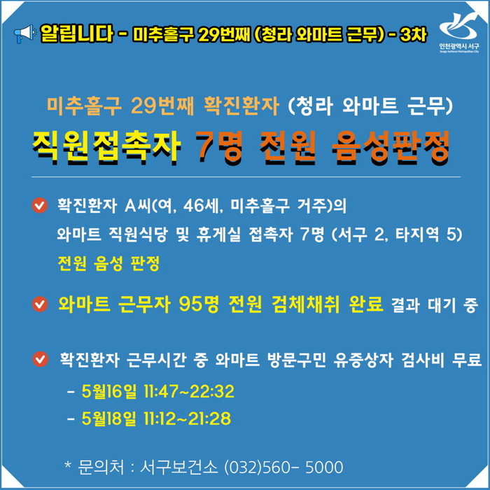 [세계로컬타임즈 장선영 기자] 인천 미추홀구 29번 확진환자가 근무하는 서구 청라 소재 마트의 직원 접촉자 7명에 대한 코로나19 검사 결과 전원 ‘음성’ 판정이 나왔다.