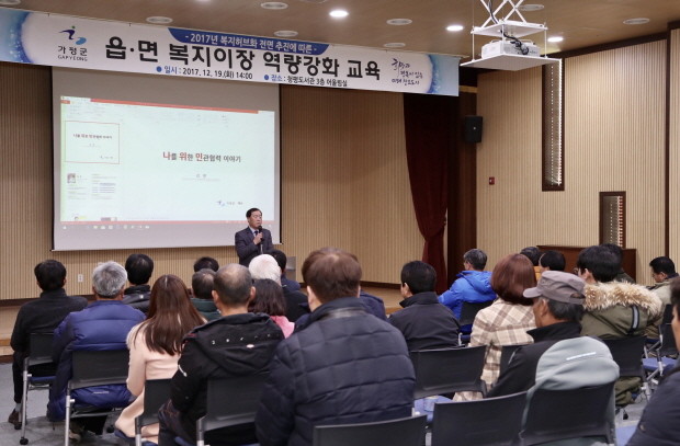 [세계로컬신문 고성철 기자] 경기도 가평군은 복지사각지대 해소 및 인적 안전망 강화를 위해 19일 청평도서관에서 김성기 군수를 비롯한 6개 읍면 맞춤형복지팀 관계자 및 이장 등 130여명이 참석한 가운데 복지이장 역량강화 교육을 실시했다.