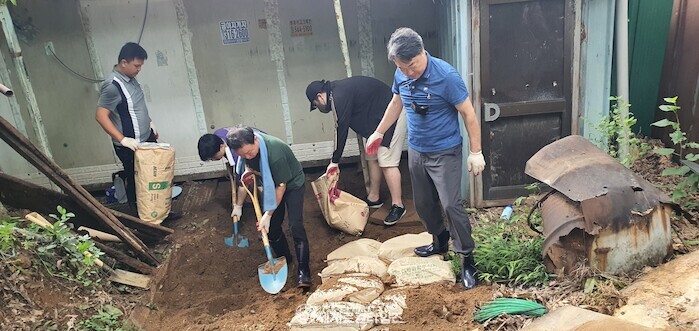 수해로 밀려온 흙을 자루에 담아 패인 계곡을 메우는 봉사활동을 진행했다.