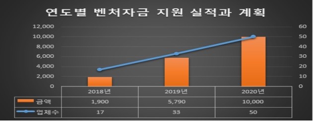 2018년 17개 기업에 19억 원 지원에 비해 3배 이상 확대된 것이며 2020년에는 50개사 100억 원을 지원할 예정이다.