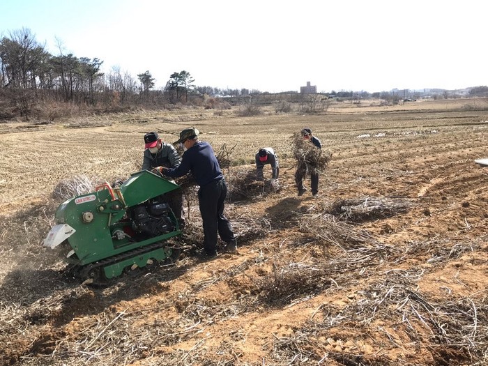 인화물질 제거사업은 2인 1조로 구성된 제거반이 자주형 목재파쇄기와 함께 현장으로 출동해 과수 전지목이나 옥수수대, 콩대 등 농업용 부산물들을 소각 대신 분쇄 처리하는 방식이다.