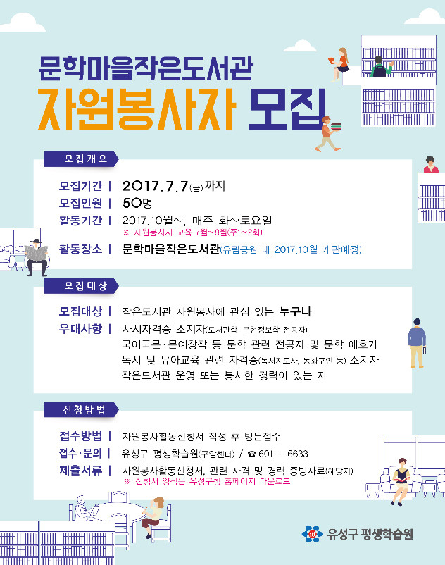 구 관계자는 “자발적이고 역량 있는 자원봉사자 모집을 통해 지역주민 스스로 만들어가는 주민주도형 작은도서관 조성에 만전을 기하겠다”고 전했다.