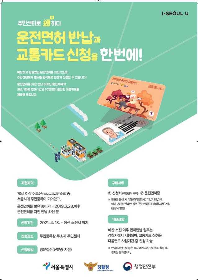 서울시에 주민등록된 만70세 이상 어르신으로 소지중인 운전면허증을 자진반납하는 경우, 거주지 주민센터에서 면허 반납과 동시에 1인당 10만 원이 충전된 교통카드를 바로 받을 수 있다.