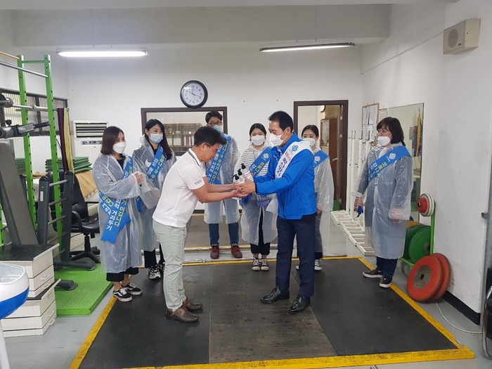 | ▲사진 위부터 박귀종(파란색 상의) 안양시체육회장이 안양시육상연맹·테니스협회 등을 방문해 손소독제를 전달하고 있다. |
