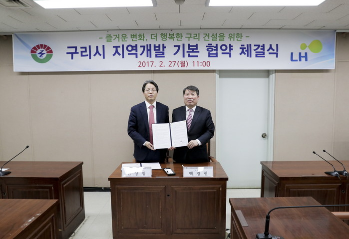 [세계로컬신문 고성철 기자] 백경현 구리시장과 김상엽 LH서울지역본부장이 27일 시청 상황실에서 ‘구리시 지역개발사업 추진을 위한 기본협약’을 체결했다.