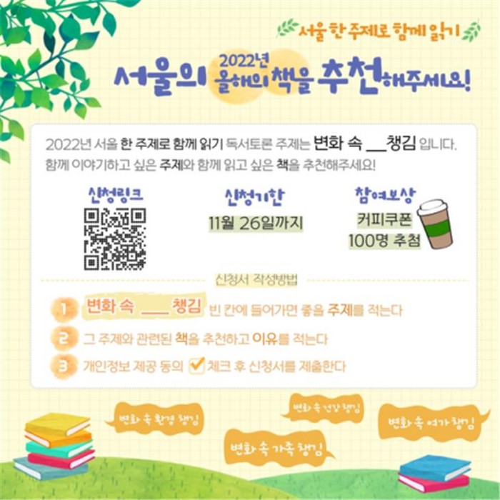 이번 ‘2022년 독서토론 주제 공모전’은 코로나와 함께하는 시대를 맞이하며 일상의 '변화' 속에서 활발히 논의해야 할 가장 중요한 가치에 대한 주제로 정했다.