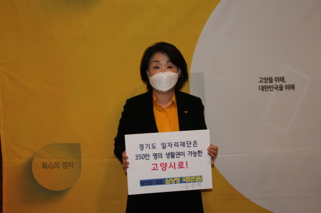 ▲고양시 지역구 국회의원 전원이 릴레이 챌린지에 동참하며 경기도 일자리재단 고양시 유치에 힘을 보탰다. 정의당 고양갑 심상정 의원도 챌린지 캠페인에 참여하고 있다. (사진=고양시 제공) |