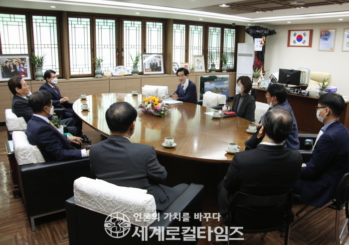 | ▲'사랑의 마스크' 전달식 후 의정부시장 및 복지관계자와 한국전문기자협회 의정부기자단 일행이 간담회를 갖고 있다. |