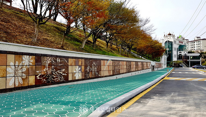 황토색 배경에 흰색으로 그려진 이 도자기 벽화는 마치 거리 속 갤러리에 있는 듯한 느낌을 선사하며 시민들에게 여유를 선물하고 있다. 단순하게 방치됐던 공간을 문화적 시각으로 승화시켜 머물고 싶은 공간으로 탈바꿈한 아이디어가 돋보인다.