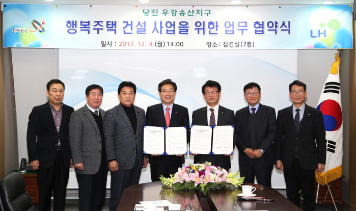 | ▲ 당진시와 LH 대전충남지역본부가 4일 당진시청 접견실에서 당진우강송산지구 행복주택 건설을 위한 업무 협약을 체결하고 기념촬영을 하고 있다. |