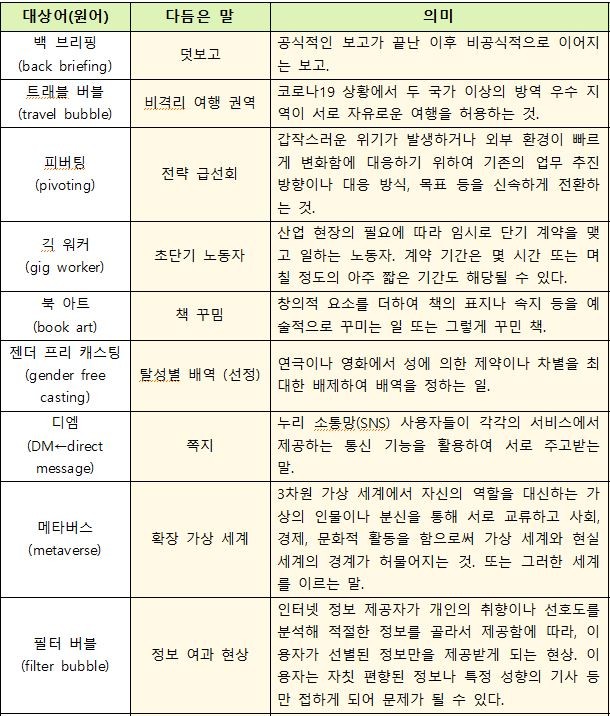 | ▲국립국어원에서 발표한 2021년 쉬운 우리말 대체어 목록. (자료=문화체육관광부 제공) |