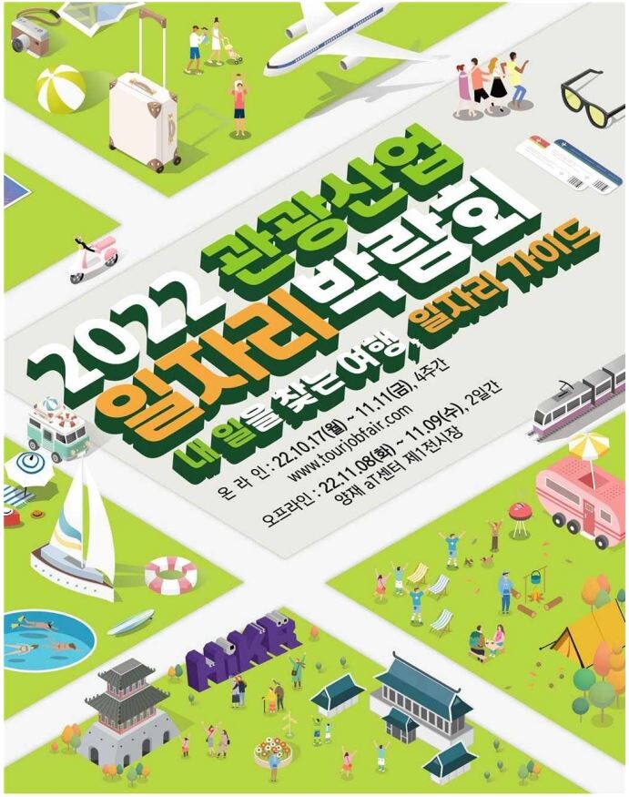 [세계로컬타임즈 이효진 기자] 문화체육관광부는 한국관광공사, 한국호텔업협회, 한국관광협회중앙회 등 12개 관계기관과 함께 17일부터 11월 11일까지 ‘2022 관광산업 일자리 박람회’를 공식 누리집과 11월 8일과 9일 서울 에이티(aT)센터서 온·오프라인으로 개최한다.